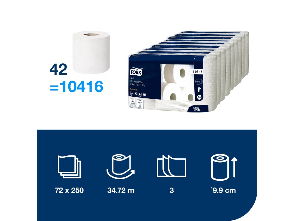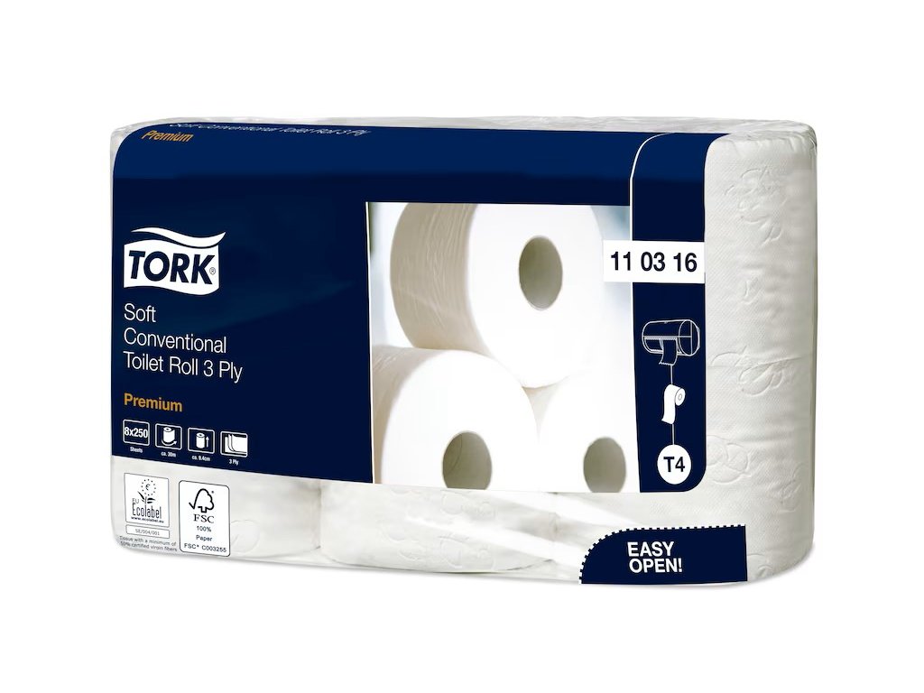 Nabídněte svým hostům komfort domova, i když jsou právě mimo domov, pomocí kvalitního toaletního papíru Tork v konvenčních rolích. Tento jemný toaletní papír nabízí prvotřídní vzhled i dotyk a na toaletách s nízkou návštěvností zaručuje odpovídající komfort. Kompatibilní s Tork zásobníky na toaletní papír konvenční role T4.
