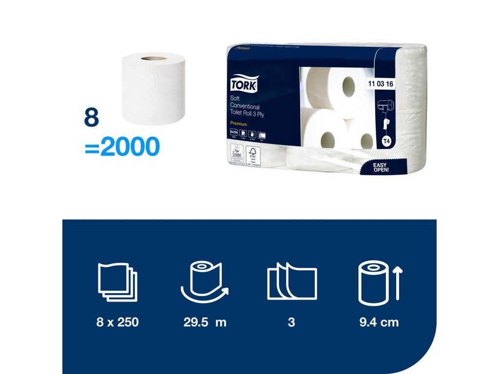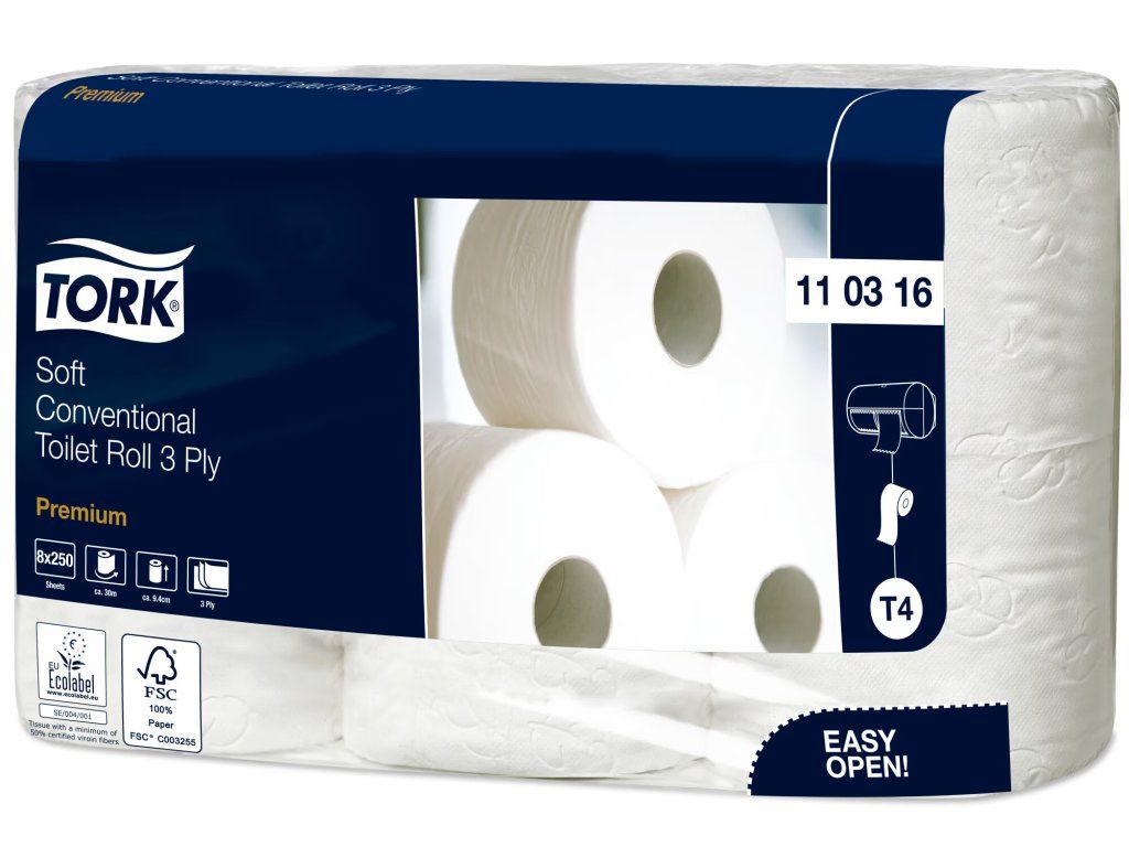 Nabídněte svým hostům komfort domova, i když jsou právě mimo domov, pomocí kvalitního toaletního papíru Tork v konvenčních rolích. Tento jemný toaletní papír nabízí prvotřídní vzhled i dotyk a na toaletách s nízkou návštěvností zaručuje odpovídající komfort. Kompatibilní s Tork zásobníky na toaletní papír konvenční role T4.
