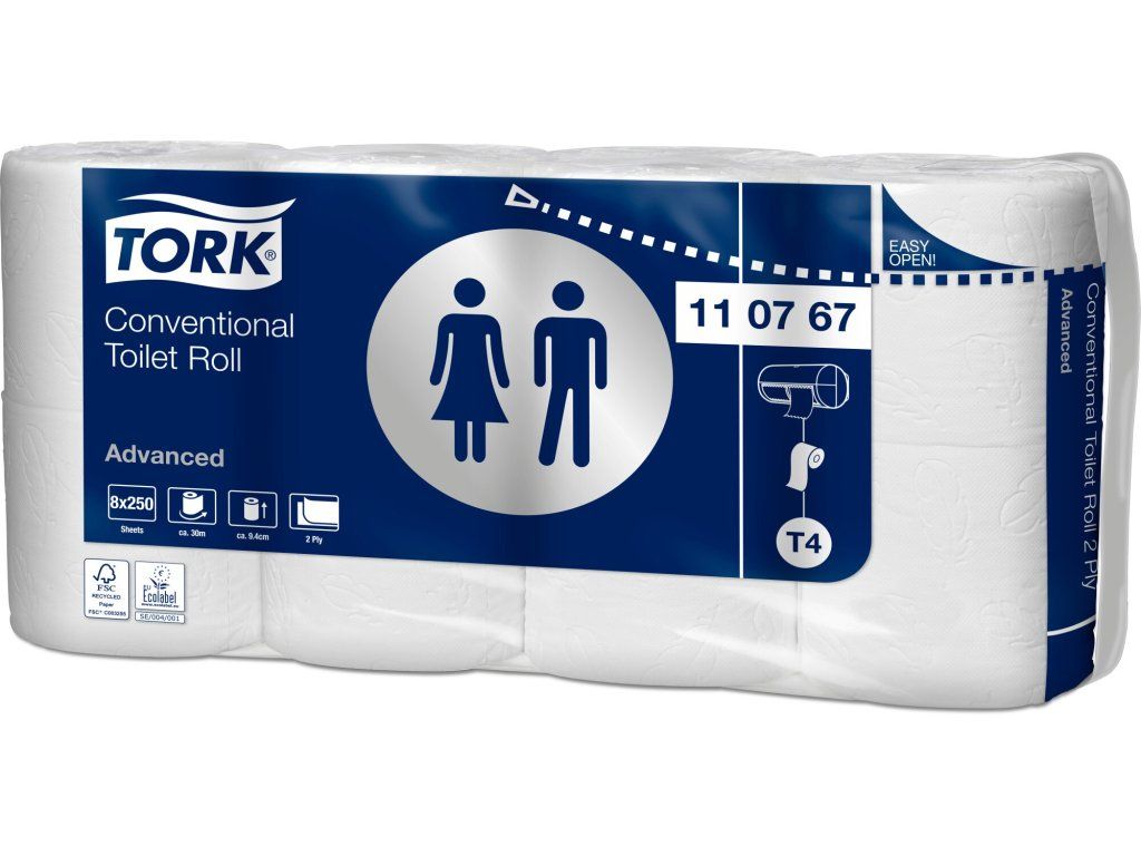 Nabídněte svým hostům komfort domova, i když jsou právě mimo domov, pomocí Advanced toaletního papíru Tork v konvenčních rolích. Tento toaletní papír je vhodný pro toalety s nízkou návštěvností a zaručuje odpovídající komfort. Kompatibilní s Tork zásobníky na toaletní papír konvenční role T4.