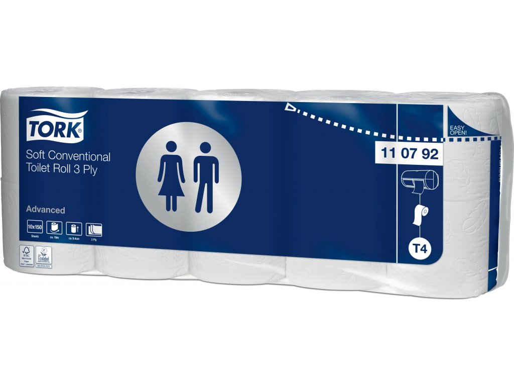 Poskytněte svým hostům toaletní papír Tork v konvenčních rolích v kvalitě Premium, aby se u vás cítili stejně pohodlně jako doma. Tento jemný toaletní papír se vyznačuje prvotřídním vzhledem, je příjemný na omak a na toaletách a v umývárnách s nízkou návštěvností zaručuje odpovídající komfort. Kompatibilní s Tork zásobníky na toaletní papír konvenční role T4.