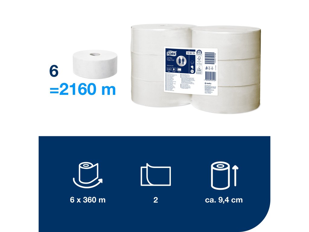 Tork Jumbo toaletní papír Advanced 2vrstvý nabízí skvělý poměr mezi náklady a kvalitou a je ideální pro provozovny s vysokou návštěvností. Papír je kompatibilní s Tork Jumbo zásobníky na toaletní papír T1, které vynikají časovou efektivitou a nižšími náklady a nabízí mnohem větší objem toaletního papíru než standardní role. Vysoká kapacita znamená méně časté doplňování.
