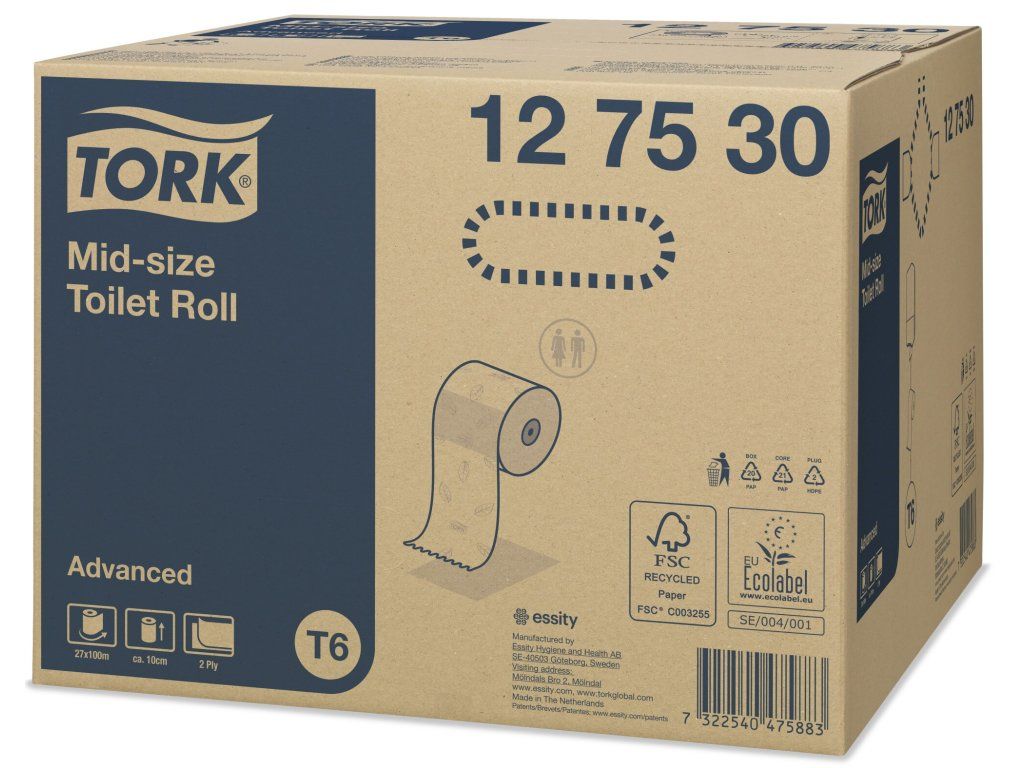 Role je vhodná pro Tork Mid-Size Twin zásobník na toaletní papír T6, který je ideální pro toalety a umývárny s nízkou až střední návštěvností, kde je cílem především spokojenost hostů. Zásobník pojme dvě plné role střední velikosti, čímž zajišťuje stálou dostupnost papíru. Díky bezdutinkovým rolím nevzniká žádný odpad.