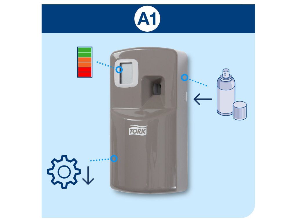 Osvěžovač vzduchu Tork v designu Elevation vylepší prostředí na jakýchkoliv toaletách či umývárnách a udělá na vaše hosty trvalý dojem. Tento dávkovač vůně je kompatibilní s Tork sprejovými vůněmi A1.