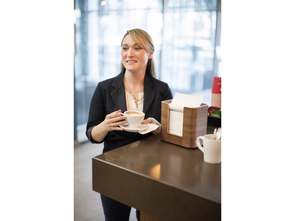 Tento elegantní zásobník, vyrobený z přírodních materiálů, dávkuje ubrousky po jednom, zvyšuje hygienu a v porovnání s tradičními zásobníky na ubrousky snižuje spotřebu minimálně o 25 %.