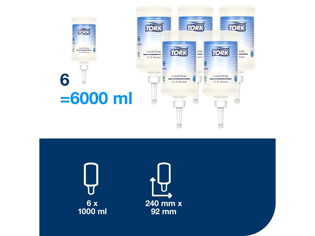 Tork průmyslové tekuté mýdlo obsahuje složky rozpouštějící tuk, které jsou vysoce účinné pro odstranění nečistot, oleje a mastnoty, a přesto jsou šetrné k pokožce. Mýdlo neobsahuje parfemaci ani barviva, a minimalizuje tak alergické reakce. Vhodný do Tork zásobníků na tekuté a sprejové mýdlo S1, které se snadno používají a nabízejí všem uživatelům dokonalou hygienu rukou.