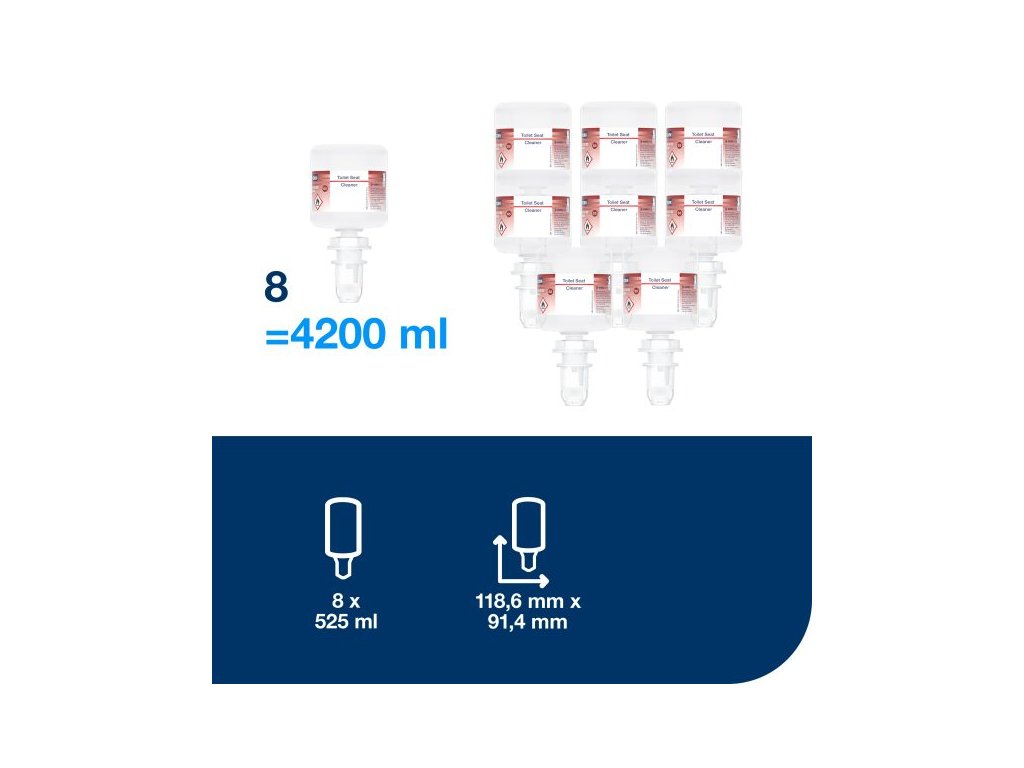 Tork čistič WC sedátek dodává návštěvníkům mimořádný pocit čistoty. Pro hygieničtější WC sedátko stačí použít jednu dávku na kousku toaletního papíru. Čistič lze použít v univerzálních Tork mini zásobnících na mýdla a dezinfekční prostředky S5, které mají certifikát snadného použití a nabízejí všem uživatelům dokonalou hygienu rukou.