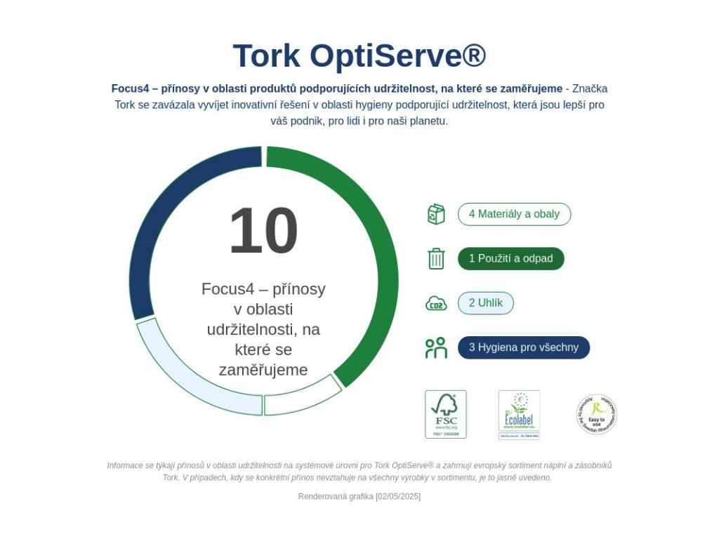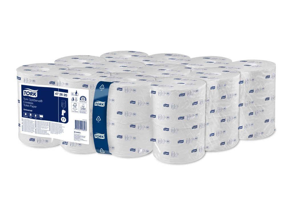 Toaletní papír je kompatibilní se systémem Tork T7 OptiServe® – vysokokapacitním řešením pro zařízení, kde je klíčová efektivita, udržitelnost a pozitivní dojem na uživatele.