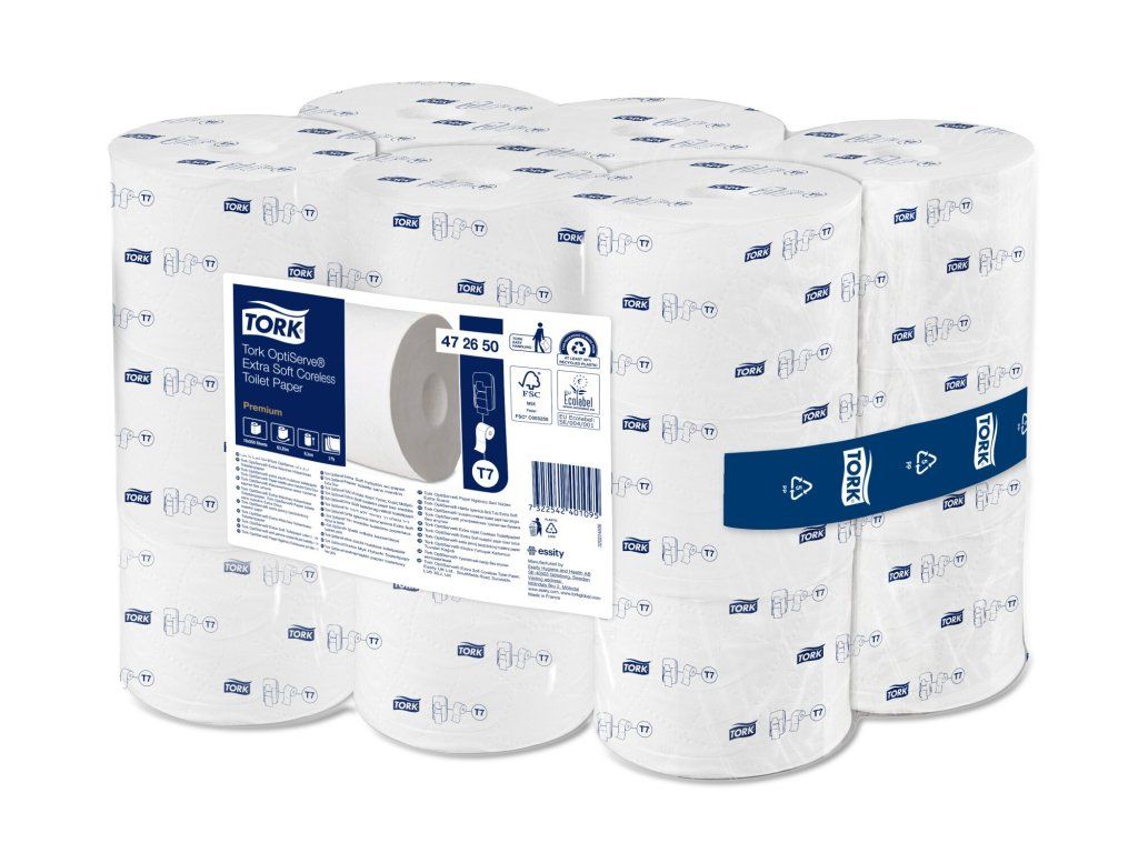 Tork OptiServe bezdutinkový toaletní papír představuje lepší alternativu k běžnému toaletnímu papíru a tradičním jumbo rolím. Jemný, luxusní, třívrstvý toaletní papír s perforací a s atraktivním potiskem ve vzoru lístků vytvoří skvělý dojem. Role obsahují 3x více papíru v porovnání s běžnými rolemi, díky čemu dochází k méně častému doplňování a úspoře času. Jsou bez dutinky a vrchní vrstvy krycího papíru, tedy vytváří méně odpadu.