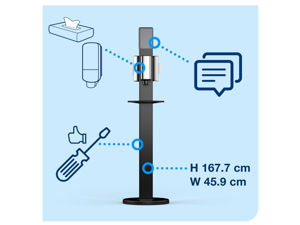 Hygienický stojan Tork pomáhá zlepšovat hygienu v kancelářích a jiných veřejných prostorách, protože zaměstnanci, hosté nebo návštěvníci mají díky němu dezinfekční prostředky na ruce a hygienický papír pohodlně na dosah. Stojan jim jednak připomíná důležitost hygieny rukou a jednak jim ukazuje, že vám záleží na tom, aby se cítili dobře.