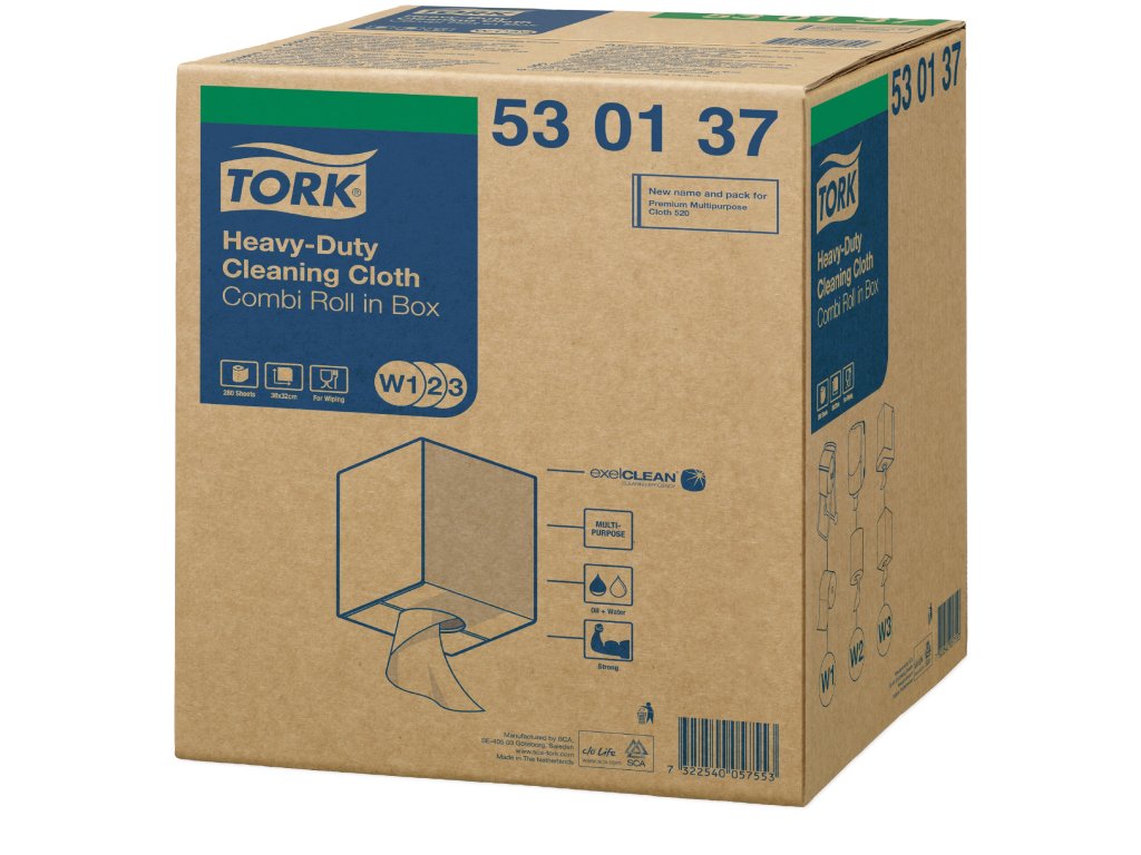 Víceúčelová Tork Heavy-Duty čisticí utěrka je vysoce absorpční, pevná a velmi trvanlivá, vydrží hrubé drhnutí, aniž by se roztrhla. Funguje v kombinaci s většinou rozpouštědel a rychle a účinně odstraňuje olej, mastnotu, vodu a nepoddajné skvrny a chrání přitom ruce před horkem a kovovými úlomky. Utěrky lze používat v Tork stojanech na podlahu W1 a v držácích rolí na zeď W1, které zaručují bezpečnost, účinnost a spolehlivost. Role jsou též kompatibilní s Tork Maxi zásobníky na role se středovým odvíjením W2, které jsou navrženy pro hladší dávkování jednou rukou. Využít lze také jednoduchý otevřený Tork zásobník na kombi role v boxu W3.