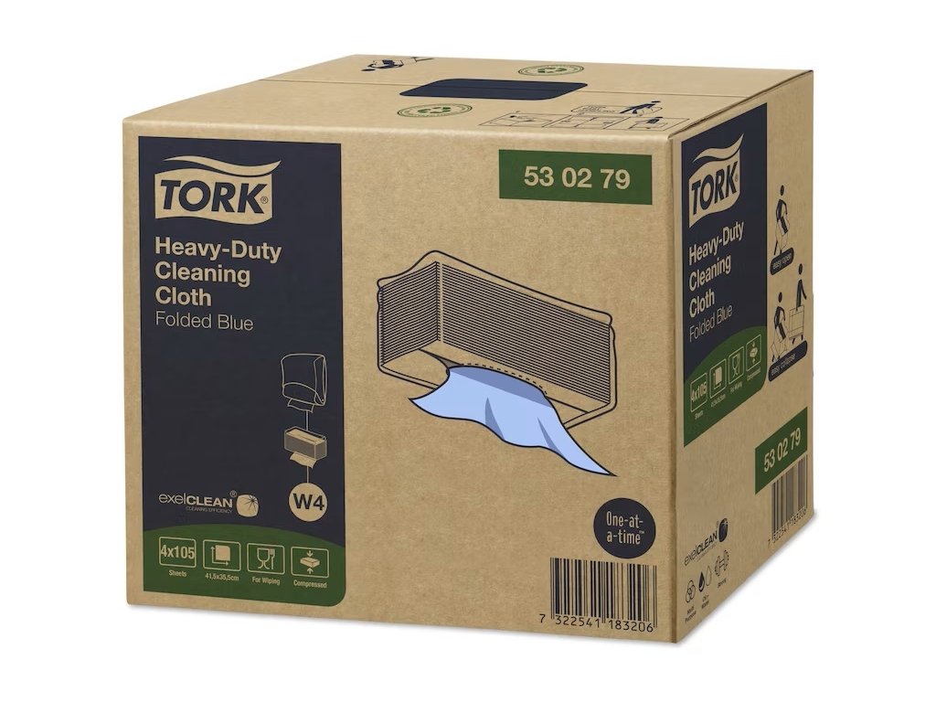 Víceúčelová čistící utěrka Tork Heavy-Duty je vysoce absorpční, pevná a velmi trvanlivá, vydrží hrubé drhnutí, aniž by se roztrhla, navíc je vhodná k opakovanému použití. Funguje v kombinaci s většinou rozpouštědel a rychle a účinně odstraňuje olej, mastnotu, vodu a nepoddajné skvrny a chrání přitom ruce před horkem a kovovými úlomky. Utěrky se dodávají v balení Tork Easy Handling®, které umožňuje rychlé a snadné přenášení, výdej po jednom kuse minimalizuje plýtvání. Obal je navíc z recyklovaného materiálu. Utěrky lze použít s Tork zásobníky na skládané utěrky W4.