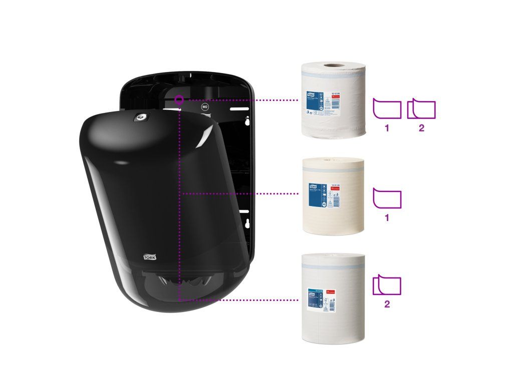 Tork® zásobník na role se středovým odvíjením v designu Elevation představuje řešení s vysokou kapacitou, vhodné pro profesionální prostředí s potřebou utírání rukou i povrchů. Utírejte povrchy rychle. Funkce neomezeného přísunu umožňuje uživatelům dávkování přesně podle jejich potřeb. Zásobníky Elevation se vyznačují funkčním a moderním designem. Kompatibilní s Tork papírovými utěrky v roli se středovým odvíjením M2.