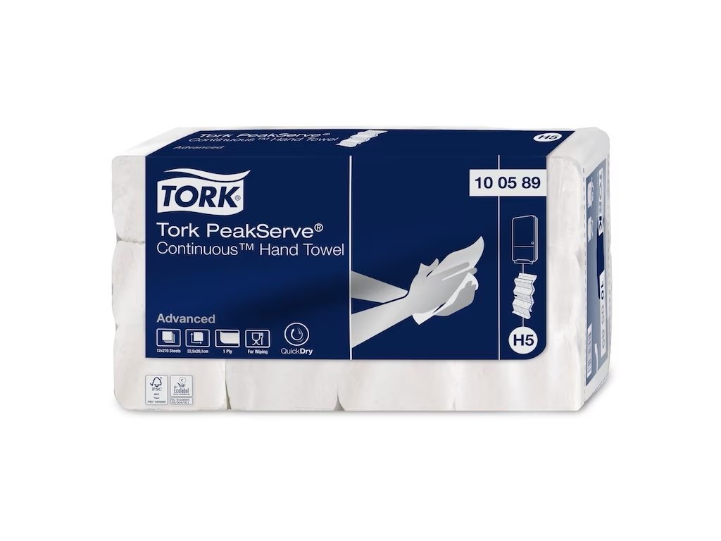 Ručníky jsou kompatibilní s Tork PeakServe® zásobníky na navazující ručníky H5- nejnovější inovace určená pro toalety a umývárny s vysokou návštěvností, kde personál potřebuje maximalizovat dobu věnovanou úklidu. Zásobník má velmi vysokou kapacitu více než 2100 ručníků, které se dávkují rychle a bez přerušení.